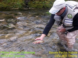 Premiers poissons, J-L ouvre le bal puis Thierry, pour ma part pêchant rarement en nymphe au fil je suis un peu larguer, mais avec les conseils de J-L et en persistant 2 poissons coup sur coup. Ensuite c’est Thierry qui prend la relève en me guidant! Il me dit